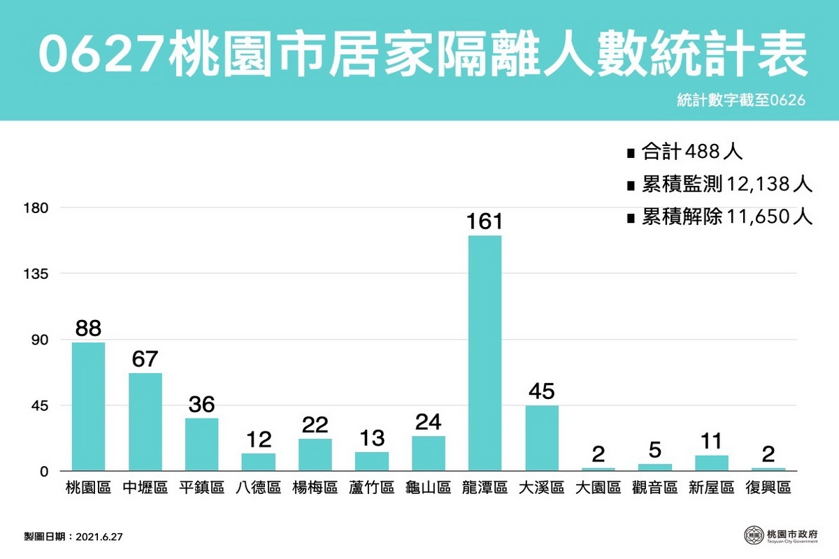 市府衛生局長王文彥表示,桃園市累計確診案例807人,目前居家隔離人數488人。27日新增3例確診皆是本土,年齡介於40多歲至60多歲之間。3人均是同職場確診者接觸(案14679、案14680、案14681)。